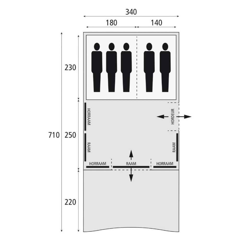 Verder beschikt deze veelzijdige tent nog over een volledige horrengaasdeur en er zit horrengaas aan de achterzijde van de binnentent. Aan weerzijden van de tent zit een handig stroomkabel doorvoersysteem die voorzien is van ritssluitingen.
