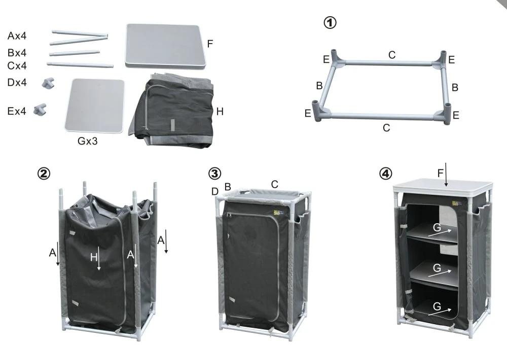 Door middel van verstelbare pootjes onder de kast kun je hem makkelijk recht zetten op een ongelijke ondergrond. Ook is de Nice campingkast voorzien van extra vakjes aan de zijkant om even snel de kleine spulletjes in weg te bergen. De campingkast wordt geleverd met een handige draagtas.