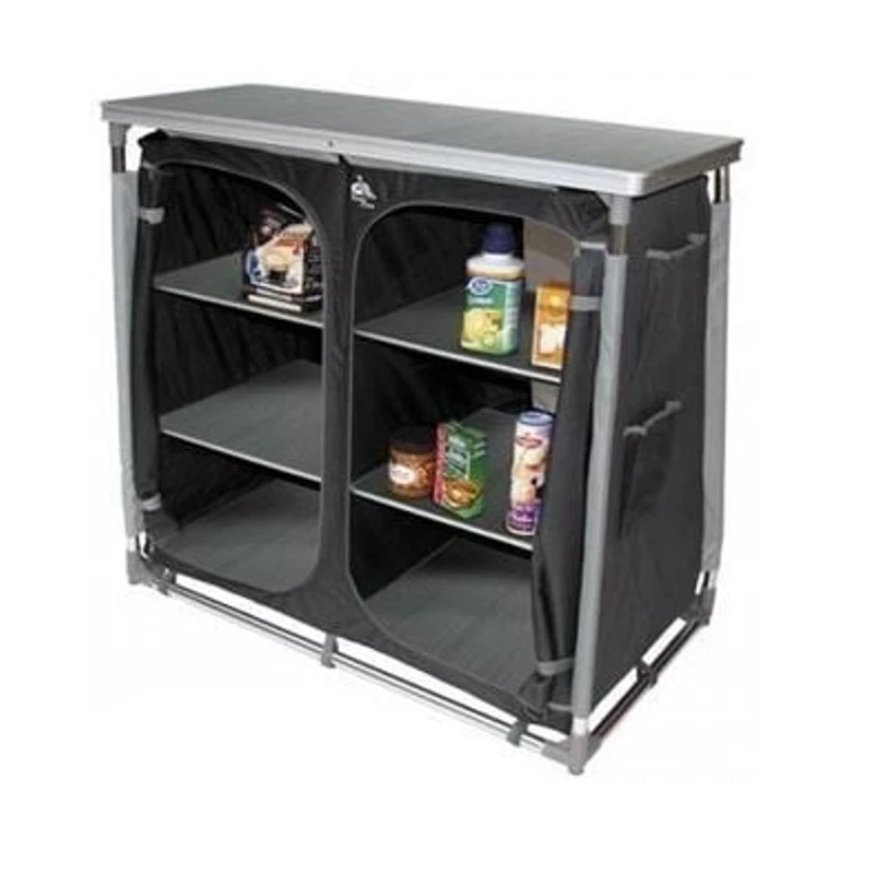 De campingkast heeft 6 aparte vakken met inlegbladen voor extra stevigheid. Dankzij de verstelbare pootjes is de kast ook op ongelijke grond toch recht te zetten. Het stevige frame is eenvoudig uit elkaar te halen waarna het geheel kan worden opgeborgen in de bijgeleverde draagtas.