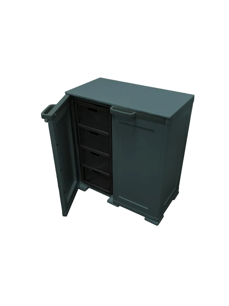 De ideale opbergkast voor de seizoenskampeerder. Stevig en af te sluiten met een hangslotje. Zols op de foto te zien is er een lade systeem los verkrijgbaar om spullen nog overzichtelijker in deze kast op te bergen.