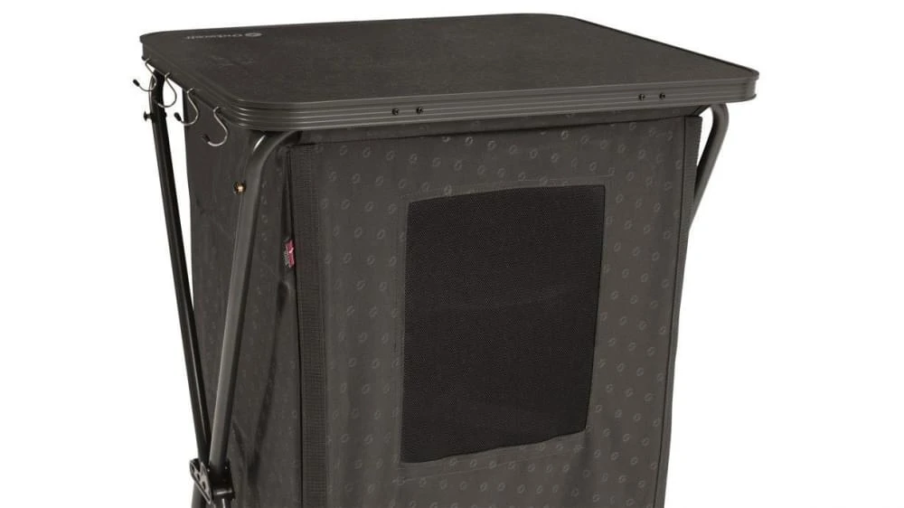De campingkast heeft drie uitneembare planken waarvan twee grote massieve planken met een draagvermogen tot 10 kg per plank, en een gaasplank bovenin met een draagvermogen tot 5 kg. Verder zit aan de zijkant van de kast een klein opberg vak waar je bijvoorbeeld je bril of wat zonnebrand in kwijt kan. De ophanghaken aan de zijkant bieden plaats voor een handdoek of theedoek. Voor nog meer opbergruimte zijn er ook bevestigingspunten gemaakt aan de zijkant voor de Neat’N’Tidy organisator M (optioneel verkrijgbaar).Â