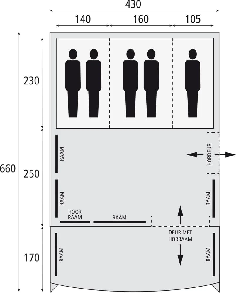 De slaapcabines zijn opgedeeld in drie aparte ruimtes. De middelste is 160 cm breed en heeft aan weerszijden scheidingswanden met ritsen. Deze kunnen makkelijk open en dicht geritst worden. De andere twee slaapcabines zijn 140 cm en 105 cm breed. Deze drie slaapcabines bevatten horrengaas in alle toegangsdeuren. De voor- en zijdeur zijn ook met een horrengaas uitgevoerd.